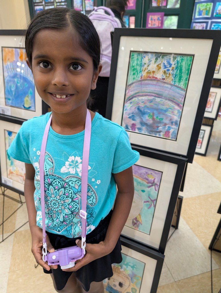 Amara the artist standing with her art at her school’s art show.