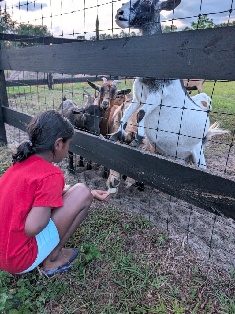 Until next week, please enjoy a picture of Amara fulfilling her lifelong dream of feeding and petting goats (so many cute babies were out there too!)